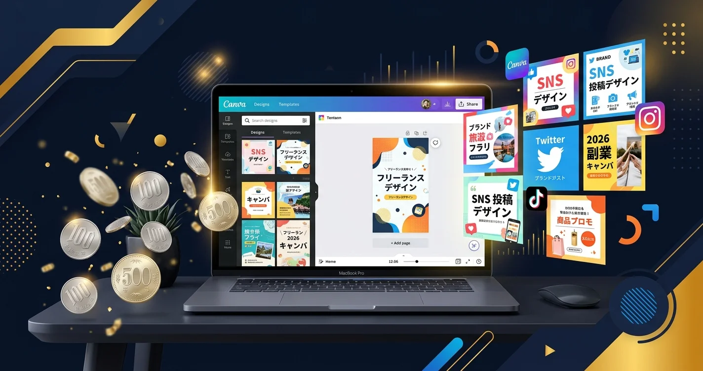 Canva副業とは、デザインツール「Canva」を使ってSNS投稿画像・バナー・資料・チラシ・動画などのデザイン成果物を制作し、企業や個人に納品することで報酬を得る副業です。プログラミング不要・デザインソフト不要・月額0円から始められるのが最大の特徴で、副業初心者に最も入りやすいジャンルの一つです。